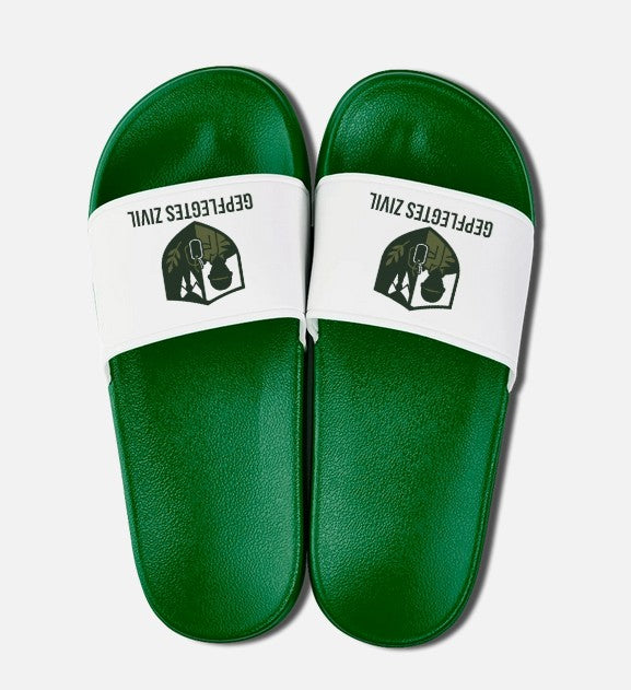 Unsere Gepflegtes Zivil™ Badelatschen vereinen Komfort mit einem klaren Statement. Das kräftige Grün trifft auf einen weißen Riemen mit dem markanten Logo – perfekt für Kaserne, Strand oder zuhause.